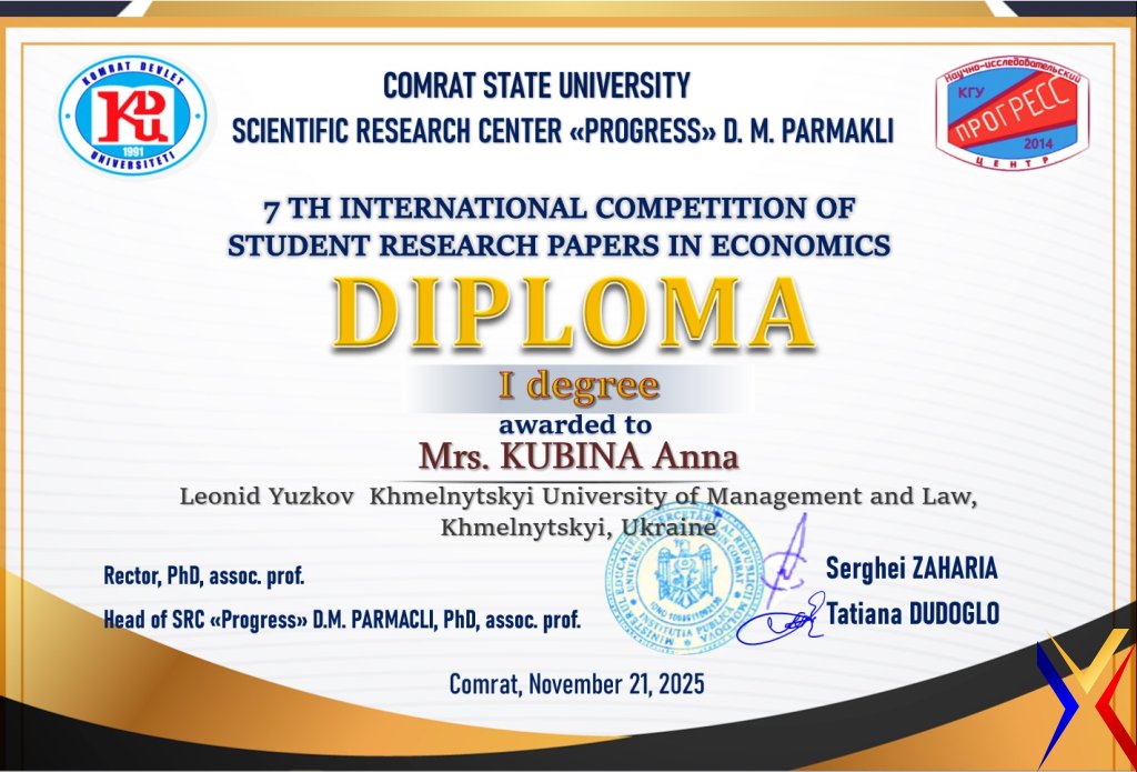 21 листопада 2025 року відбувся VII Міжнародний конкурс студентських науково-дослідницьких робіт з економіки, організований НІЦ «ПРОГРЕС» ім. Д.М. Пармаклі при Комратському державному університеті (КДУ, Республіка Молдова). З гордістю повідомляємо, що Анна КУБІНА, здобувачка вищої освіти освітнього ступеня магістра за спеціальністю D2 «Фінанси, банківська справа, страхування та фондовий ринок», отримала диплом І ступеня за наукову роботу на тему: "Organizational and Economic Mechanism of Functioning of the Health Insurance System”. Науковий керівник — Юлія АЛЕСКЕРОВА, професор кафедри фінансів, банківської справи, страхування та фондового ринку.