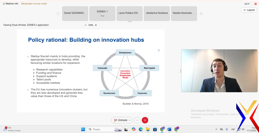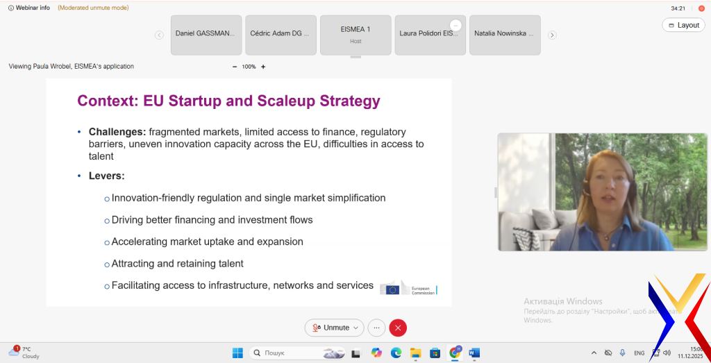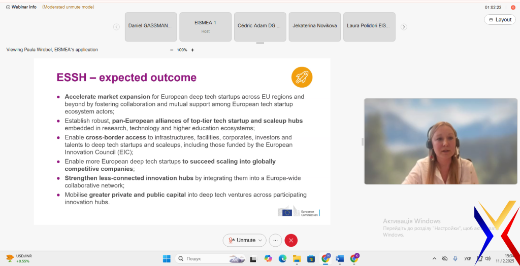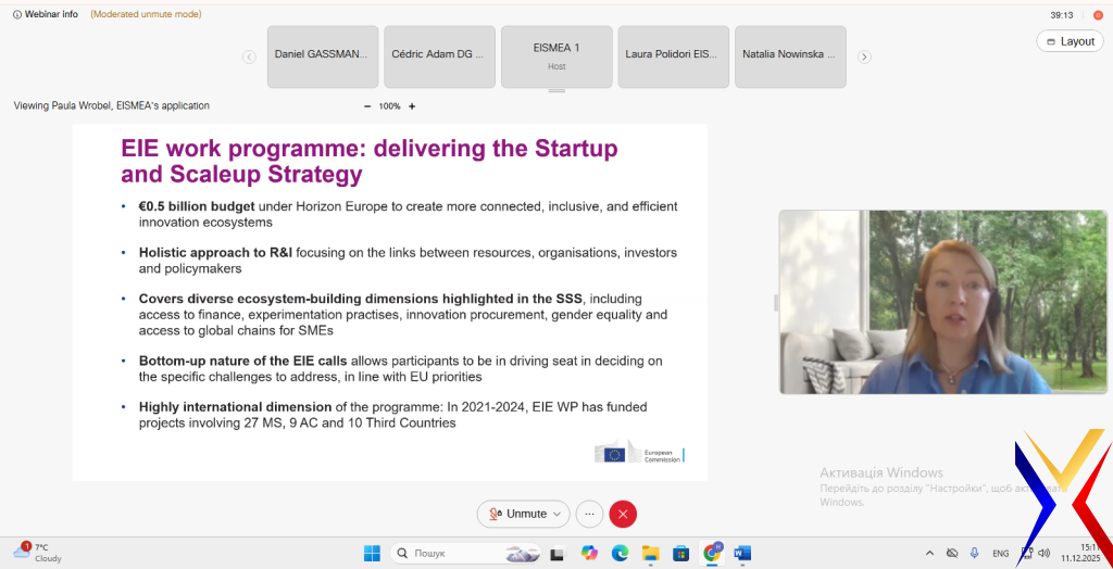11 грудня 2025 року завідувач науково-дослідної частини Шевчук Інна Володимирівна та фахівець І категорії відділу з координації наукових заходів, міжнародного співробітництва та грантової діяльності Петровська Юлія долучилися до онлайн-вебінару, присвяченому пілотному конкурсу European Startup and Scaleup Hubs (HORIZON-EIE-2026-02-CONNECT-01) у рамках робочої програми Європейських інноваційних екосистем (European Innovation Ecosystems) на 2026-2027 роки Програми «Горизонт Європа». Онлайн-захід організовано Європейською інноваційною радою (EIC), Виконавчим агентством з питань Європейської інноваційної ради та МСП (EISMEA) та Генеральним директоратом з досліджень та інновацій ЄК (RTD). Мета вебінару ‒ ознайомити учасників з ключовими напрямами інноваційної політики ЄС, що визначають сучасні механізми підтримки стартапів та підприємств, які масштабуються. Експерти окреслили стратегічну мету пілотного конкурсу, що спрямований на створення та розвиток європейських центрів підтримки інноваційного бізнесу, посилення співпраці між регіональними екосистемами та формування сприятливих умов для зростання підприємницького сектору. Окремий блок був присвячений політичному контексту запуску конкурсу, зокрема його важливості для зміцнення інноваційного потенціалу держав-членів ЄС та країн-партнерів. Учасникам представили основні вимоги, критерії оцінювання заявок та очікувані результати реалізації проєктів.