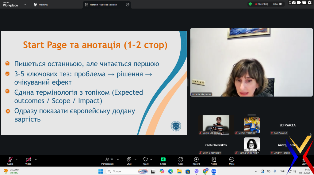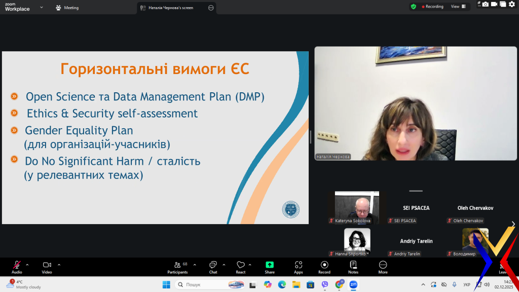 2 грудня 2025 року представниця науково-дослідної частини Петровська Юлія взяла участь у тренінгу Школи грантрайтингу «Підготовка та подання проєктних пропозицій для участі в конкурсних програмах “Горизонт Європа”». Захід був спрямований на поглиблення практичних навичок щодо розроблення конкурентоспроможних проєктних заявок та їхнього ефективного управління. Учасники тренінгу ознайомилися зі структурою проєктних заявок Horizon Europe, логікою побудови проєкту та ключовими елементами, на які звертають увагу експерти ЄС під час оцінювання. Окремий акцент було зроблено на фінансовому плануванні, правильному розподілі бюджетних ресурсів, уникненні типових помилок та обґрунтуванні витрат. Також розглядалися питання ефективної комунікації в межах міжнародних консорціумів, побудови результативної взаємодії між партнерами та сучасних підходів до поширення результатів проєкту. Учасники отримали практичні поради щодо підготовки якісних описів впливу (impact), робочих пакетів, ризик-менеджменту та застосування комунікаційних інструментів. Наприкінці тренінгу було представлено приклади успішної участі українських установ у програмі «Горизонт Європа», а також можливості доступу до дослідницької інфраструктури Європейського Союзу, що відкриває додаткові перспективи для українських науковців.