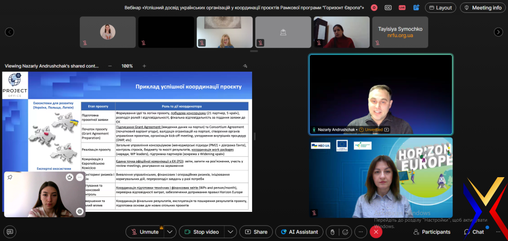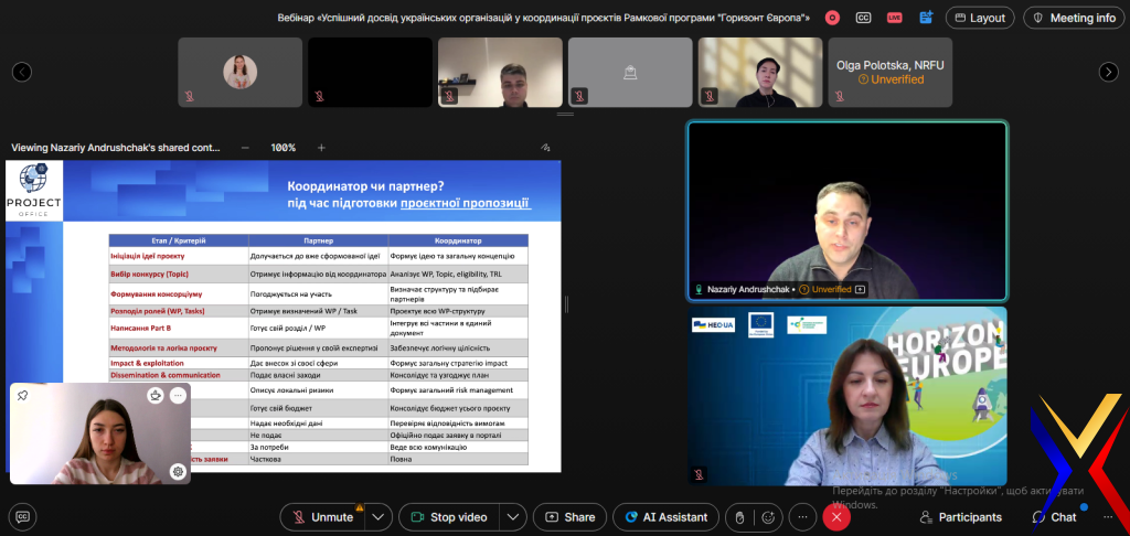 16 грудня 2025 року завідувач науково-дослідної частини Шевчук Інна Володимирівна та фахівець І категорії відділу з координації наукових заходів, міжнародного співробітництва та грантової діяльності Петровська Юлія долучилися до онлайн-вебінару «Успішний досвід українських організацій у координації проєктів Рамкової програми «Горизонт Європа»», присвячений практичним аспектам координації міжнародних наукових проєктів та ролі грантових і проєктних офісів у цьому процесі. У межах заходу було представлено досвід Національного університету «Львівська політехніка» у координації проєктів «Горизонт Європа», зокрема щодо ролі координатора проєкту, функцій грантового офісу, організації ефективної координації консорціуму та прикладів успішних проєктів. Також було обговорено досвід Інституту молекулярної біології і генетики НАН України, включно з практичними уроками для українських установ: кадрова гнучкість, розподіл ролей між науковою та адміністративною координацією, узгодження внутрішніх процедур з вимогами Європейської комісії та планування навантаження ключових науковців. Вебінар завершився сесією запитань та відповідей, під час якої учасники мали змогу обговорити актуальні виклики координації міжнародних проєктів та отримати практичні поради.