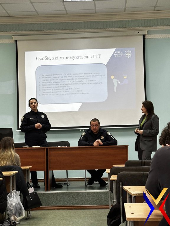 31 березня 2026 року до юридичного факультету Хмельницького університету управління та права імені Леоніда Юзькова в межах вивчення навчальної дисципліни «Конституційне право України» (викладач - доцент кафедри конституційного,адміністративного та фінансового права,доктор філософії з права Владовська К.П.) завітали представники ГУНП в Хмельницькій області: інспектор ВОДІТТМТЗ (відділу організації діяльності ізоляторів тимчасового тримання та моніторингу дій із затриманими), капітан поліції Юлія Цісарук та старший черговий ІТТ № 1, капітан поліції Василь Мороз. Гості провели інформаційно-роз’яснювальну лекцію на тему "Порядок організації роботи ізоляторів тимчасового тримання територіальних органів поліції". Правила внутрішнього розпорядку в ізоляторах тимчасового тримання». Під час заходу було висвітлено особливості функціонування ізоляторів тимчасового тримання, основні вимоги до умов утримання затриманих осіб, порядок організації роботи персоналу ІТТ, а також дотримання прав людини під час перебування осіб в ізоляторах. Окрему увагу лектори приділили правилам внутрішнього розпорядку, режиму утримання та практичним аспектам службової діяльності працівників поліції. Студенти мали можливість поставити запитання та отримати фахові відповіді, що сприяло кращому розумінню особливостей роботи правоохоронних органів у даній сфері. Дякуємо представникам ГУНП в Хмельницькій області за змістовну та пізнавальну лекцію!