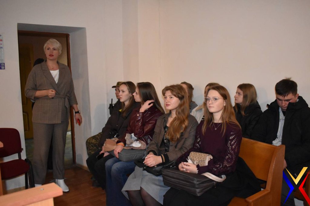 16 жовтня 2025 року студенти 3-го та 4-го курсів спеціальності Міжнародне право юридичного факультету Хмельницького університету управління та права імені Леоніда Юзькова відвідали судове засідання. Візит відбувся за ініціативи студентів, організований викладачем, доктором філософії за спеціальністю Право та практикуючою суддею Хмельницького міськрайонного суду Світланою Олександрівною Даньковою. Під час візиту студенти спостерігали за судовим розглядом кримінального провадження. Публічне обвинувачення у справі підтримував керівник Окружної прокуратури м. Хмельницького Ростислав Петраш. Окрім споглядання за процесуальними діями, студенти також мали нагоду звернути увагу на невід’ємні атрибути правосуддя. Відвідування суду стало практичним нагадуванням про Статтю 16 Закону України «Про судоустрій і статус суддів», яка визначає символи судової влади: Державний Герб та Прапор України, а також обов’язкове здійснення правосуддя суддею в мантії та з нагрудним знаком.