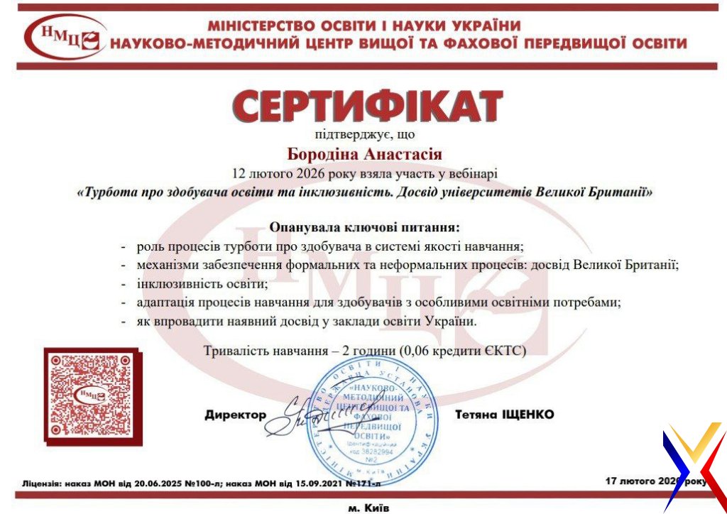 Сьогодні турбота про ментальне здоров’я (wellbeing) та забезпечення інклюзивності - це не просто світові тренди, а фундаментальна основа сучасної вищої освіти. 12 лютого 2026 року відбулася знакова подія, що об’єднала досвід провідних університетів Великої Британії та прагнення української академічної спільноти до змін. Здобувачка першого курсу спеціальності D5 «Маркетинг» Хмельницького університету управління та права (ХУУП), Анастасія Бородіна, долучилася до вебінару «Турбота про здобувача освіти та інклюзивність. Досвід університетів Великої Британії».