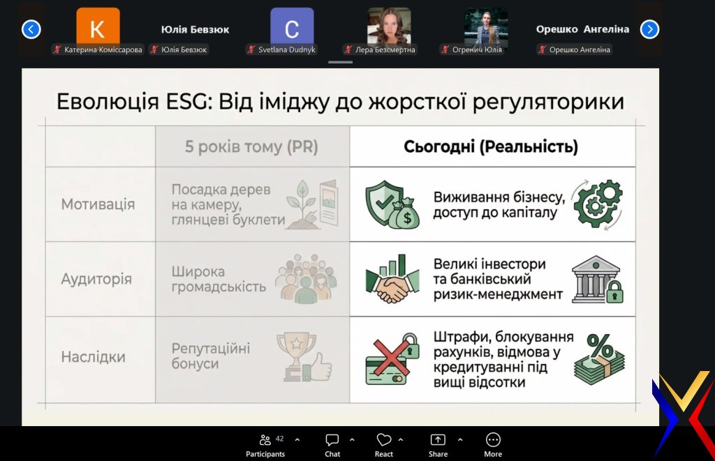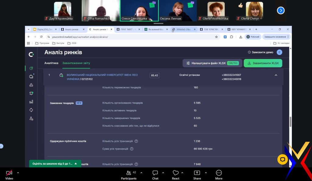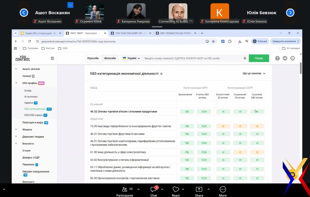 31 березня 2026 року здобувачі магістерського рівня за спеціальністю «Менеджмент» у межах вивчення дисципліни «Планування та організація власного бізнесу» (викладач — Дар’я Арзянцева, к.е.н., доцентка, доцентка кафедри) долучилися до онлайн-події «Використання інформаційної бази YouControl для формування корпоративної звітності (інтегрованої та ESG-звітності)».