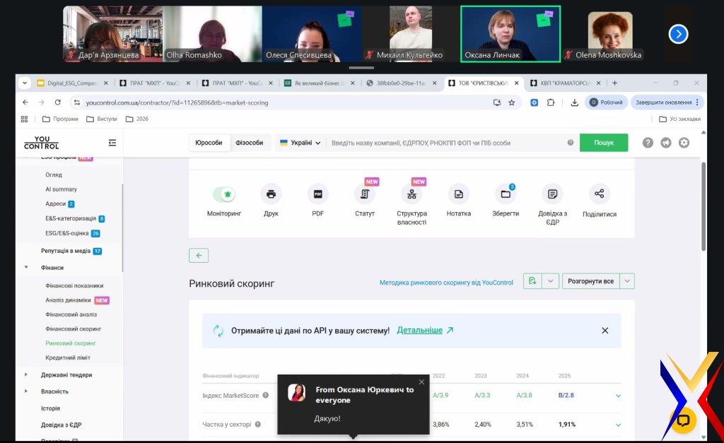 У межах заходу було розглянуто сучасні підходи до формування корпоративної звітності з урахуванням ESG-принципів, а також практичні можливості використання аналітичної системи YouControl для збору, перевірки та інтерпретації даних. Особливу увагу приділено інтегрованій звітності як інструменту підвищення прозорості діяльності підприємств, управління ризиками та формування довіри з боку інвесторів і зацікавлених сторін.