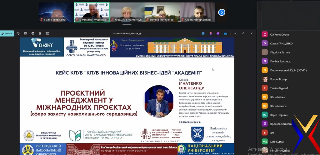 18 березня 2026 року викладачі кафедри менеджменту, економіки, статистики та цифрових технологій разом зі студентами магістратури за спеціальністю D3 Менеджмент галузі знань D Бізнес, адміністрування та право взяли участь у черговому засіданні Кейс-клубу інноваційних бізнес-ідей «Академія», організованому Інженерним навчально-науковим інститутом ім. Ю.М. Потебні Запорізького національного університету спільно з Хмельницьким університетом управління та права імені Леоніда Юзькова.