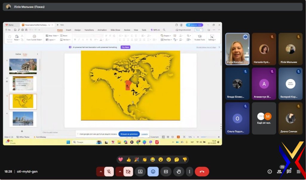 20 листопада 2025 року у рамках продовження серії міжнародних інтерактивних онлайн-занять у Хмельницькому університеті управління та права ім. Леоніда Юзькова відбулася лекція викладачки кафедри німецької та слов’янської філології університету Манітоби (Вінніпег, Канада) ІРИНИ КОНСТАНТЮК. Лекція на тему «Teaching Ukrainian as a Foreign Language Using Contemporary Media» стала платформою для активного обговорення академічних підходів та практичних кейсів у викладанні української мови як іноземної, де учасники змогли обмінятися досвідом та ідеями.