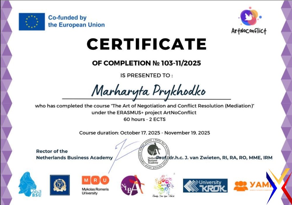 Здобувачка вищої освіти, що навчається за освітньою програмою «Бакалавр філології. Германські мови та літератури (переклад включно, перша - англійська) Маргарита Приходько успішно завершила онлайн-курс «The Art of Negotiation and Conflict Resolution (Mediation)». Маргарита взяла участь у другій хвилі (17.10.2025–19.11.2025) міжнародного проєкту ArtNoConflict, створеного у партнерстві з Erasmus+, який триває з 01.02.2024 до 31.01.2027.