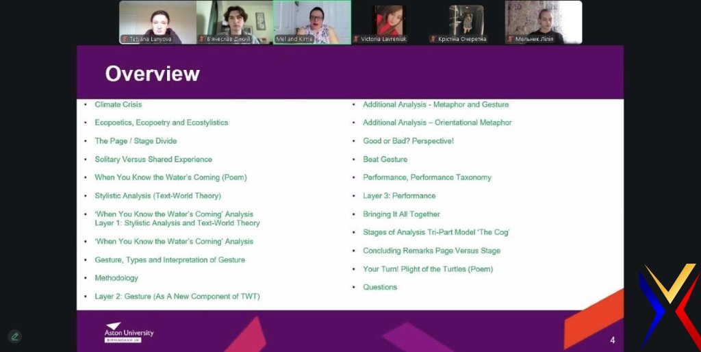 3 листопада 2025 року на платформі Zoom відбулася гостьова лекція Мел Уордл Вуденд, поетеси і дослідниці з Великої Британії, на тему «Стилістика екопоезії: на сторінках і на сцені» для студентів групи 41Ф у рамках вивчення дисципліни «Стилістика основної іноземної мови». Як поетеса Мел Уордл Вуденд відома своїми публічними виступами на поетичних заходах та воркшопами з написання поезій. Як здобувачка докторського ступеня в Астонському університеті вона проводить дослідження стилістичних особливостей екопоезії, приділяючи особливу увагу зіставленню специфіки друкованої і виголошеної поезії. У своїй лекції науковиця окреслила методологічні принципи стилістичного аналізу екопоезії, охарактеризувала застосовуваний нею інструментарій стилістичного аналізу та детально описала компоненти розробленої нею моделі комплексного стилістичного аналізу екопоетичних творів. Лекторка проілюструвала застосування розробленої моделі на прикладі аналізу кількох поетичних творів, написаних сучасними авторами. Лекція мала інтерактивний характер, що забезпечило активну залученість студентів до сприйняття матеріалу. Лекцію організувала і модерувала доцентка кафедри мовознавства факультету управління та економіки Тетяна Луньова.