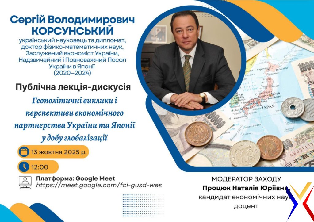 13 жовтня 2025 року у Хмельницькому університеті управління та права імені Леоніда Юзькова для студенти освітніх рівнів бакалавр, магістр та доктор філософії за спеціальностями Менеджмент, Фінанси, банківська справа, страхування та фондовий ринок, Публічне управління та адміністрування, Туризм та рекреація мали можливість відвідати публічну лекцію-дискусію з Сергієм Володимировичем Корсунським, українським науковцем, дипломатом, доктором фізико-математичних наук, Заслуженим економістом України, Надзвичайним і Повноважним Послом України в Японії (2020–2024 рр.). Публічна лекція відбулася на платформі Google Meet і стала цінним майданчиком для обміну знаннями та досвідом. Захід сприяв розширенню уявлень студентів про глобальні процеси у світовій економіці, актуалізував питання міжнародної співпраці України та надихнув молодь до подальших наукових пошуків у сфері міжнародного менеджменту та дипломатії.