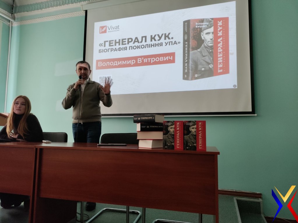 19 березня 2026 року для студентів юридичного факультету Хмельницького університету управління та права імені Леоніда Юзькова відбулася презентація книги Володимира В’ятровича «Генерал Кук». Автор змістовно й захопливо розповів про життєвий шлях і боротьбу легендарного командира УПА Василя Кука, акцентуючи увагу на маловідомих сторінках його діяльності. Під час зустрічі було висвітлено складні історичні обставини середини ХХ століття та роль українського визвольного руху.