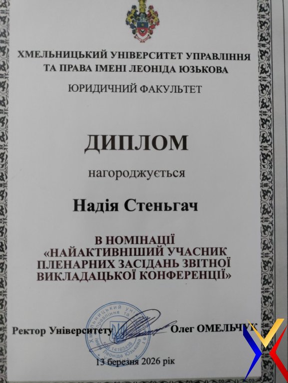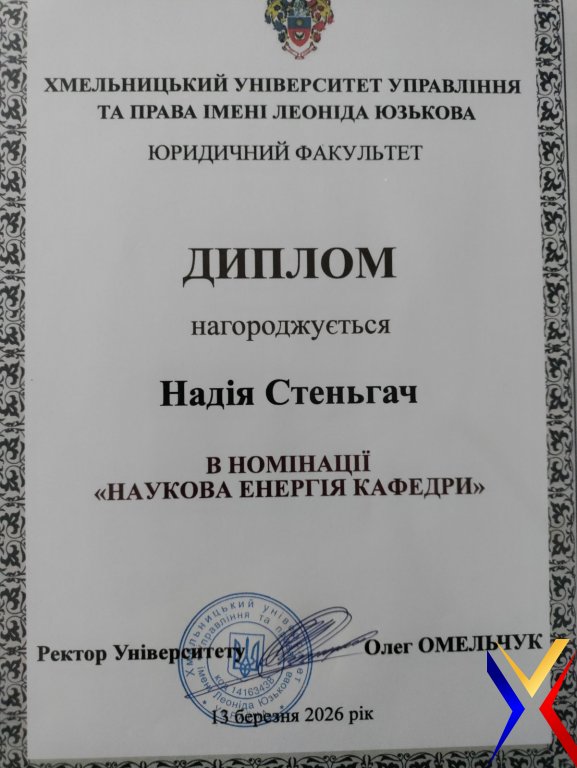 13 березня 2026 року у Хмельницькому університеті управління та права імені Леоніда Юзькова відбулася XXX ювілейна звітна наукова конференція науково-педагогічних працівників, докторантів та аспірантів «Управлінські та правові засади забезпечення розвитку України як європейської держави». Була відзначені професорка кафедри, кандидатка історичних наук, доцентка Надія Стеньгач у номінаціях «Наукова енергія кафедри» і «Найактивніший учасник пленарних засідань викладацької конференції» та докторка філософії з права, доцентка кафедри Анна Данілова у номінації «Науковий прорив року».