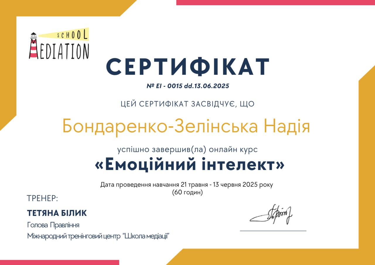 3. «Емоційний інтелект» курс Міжнародного тренінгового центру «Школа медіації» (2025)